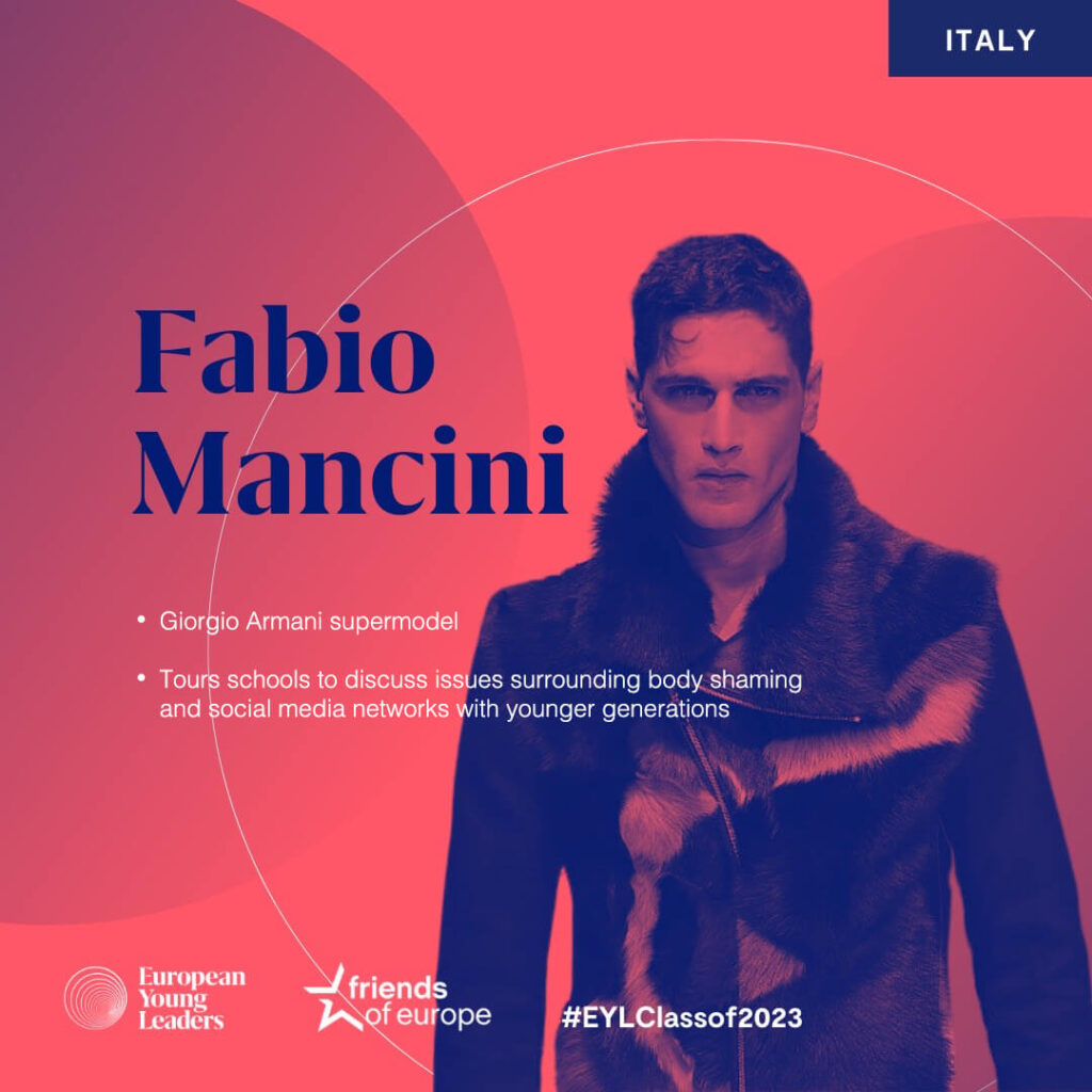 Il supermodello italiano Fabio Mancini, scelto per rappresentare l’Italia fra i 46 maggiori leader europei con il suo progetto scuole e per parlare della sua carriera
